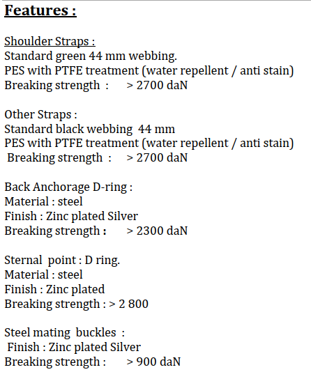 o Fluo green textile, high visible stitching, back fall indicators to facilitate visual inspection before working